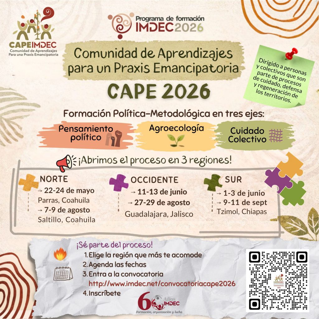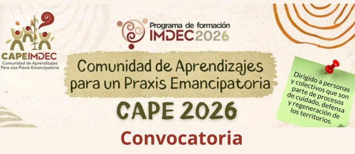 Te invitamos a formar parte de la Comunidad de Aprendizajes para una Praxis Emancipatoria, la CAPE, ciclo 2026; un espacio de encuentro y diálogo para la construcción colectiva de conocimientos y nuevas prácticas sociopolíticas, más coherentes, fortalecidas y articuladas, en el contexto de emergencia civilizatoria que vivimos. En la CAPE partimos del reconocimiento y la celebración de la diversidad, para que el cuidado y la defensa de la vida con dignidad, y los territorios, no sean sólo un discurso sino una praxis cotidiana.